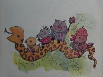 贝贝越长越大,变得又粗又长,也更贪玩了。有一次,它让小鸡小鸭,还有小猫小兔骑在自己身上,带着它们去外面玩。它游过田埂,爬上了公路。人们都吓坏了:啊,一条大花蛇!