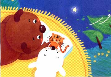 幼儿园放暑假了,大熊跟小兔在灯下看图画书。忽然,小兔瞪大了眼睛盯着图画书上的图,“别翻,别翻!”他叫道。