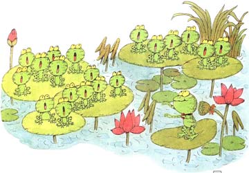 一群青蛙整齐地站在荷叶上,齐声歌唱着。瞧,他们还 有一个指挥呢!