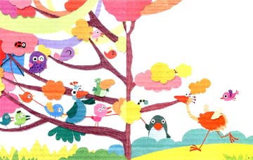 生日庆祝会开始了。孔雀跳起優美的舞蹈,鹦鹉给大家表演杂技,一群喜鹊飞上树梢,唱起动听的歌。接着,所有的鸟儿一起围着大个子鸵鸟,大声地唱起“生日歌”:“祝你生日快乐,祝你生日快乐,亲的鸵鸟!”