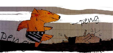 小鸡吓得一声也不敢吭。大狗熊又看见路上有一排扇子状脚印,知道小鸭在前面,就“嘭嘭嘭”地追上去,一把推开小鸭说:“让开!让开!这条路只许我一个人走!”