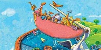 过了一会儿,“大飞机” 降落在小河上,变成了一艘“大轮船”。从来没到河面上玩过的小鸡们和小鸭、小鹅、小鹈鹕一起打水仗,别提有多快活了!