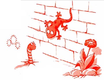闷热的中午,小壁虎也不闲着。它正趴在长满爬山虎的院墙上捉蚊子呢!忽然,远处传来“噼啪噼啪”的声音,小壁虎想去瞧一瞧!可它身一子一侧,不小心摔到了地上。它连忙向墙角爬去。突然,一个光滑的脑袋从泥土里钻了出来,说:“你好啊!小壁虎。”