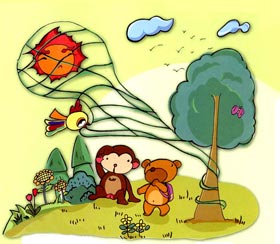 小猴和小熊爬上树,解一开网,太一陽一很快就向天空飞去。