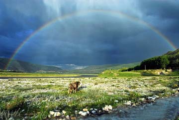 它把雨点洒向大山,大山立刻变成彩虹色的了。