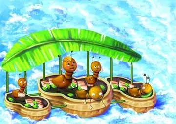 一会儿,四只蚂蚁抗来两根树枝,三只蚂蚁抬来一片芭蕉叶,还 有几只蚂蚁拖来一块面包。