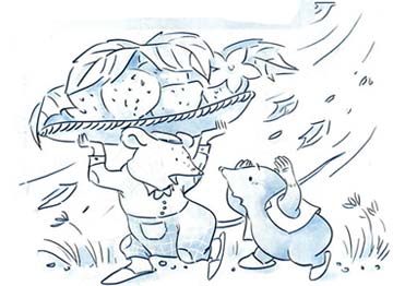 “呦,天哪!”鼹鼠叫了起来,“天要下雨了!要是没草帽护着脑袋,准会感冒的。”于是,鼹鼠抬起腿,顺着风,去追赶自己的草帽。