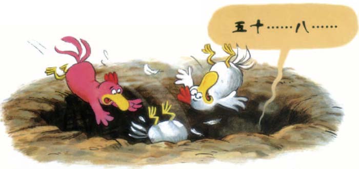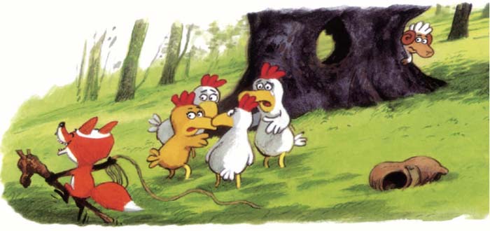 本页故事概况:小公鸡们在玩捉迷藏的游戏时为了争抢躲藏的地方打了起来,他们打得那么专注,竟然没发现危险正在靠近—他们一个个地被小狐狸们抓起来,扔进了储藏洞……