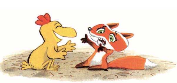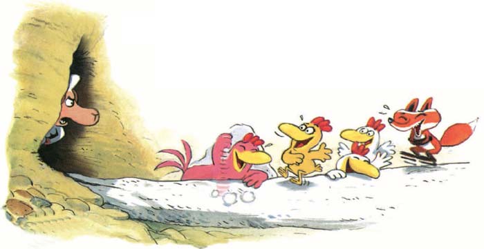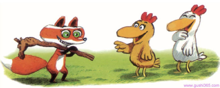“干得好,儿子们!看得出这些猎物非常棒!”狐狸转身对小公鸡们说,“打架的先生们,欢迎你们来到‘辣手狐狸’的洞。”
