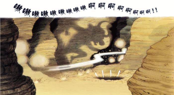突然,地面震动起来,一个巨大的幽灵突然从地下冒出来。“怪物科尼!”狐狸们尖叫着各自奔命,惊慌失措地大逃亡!