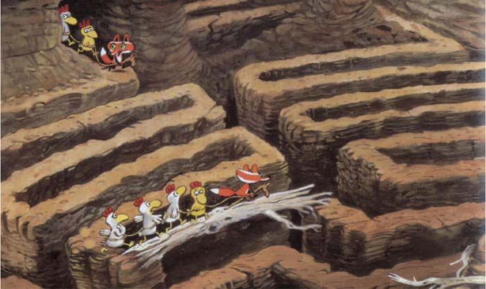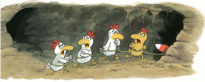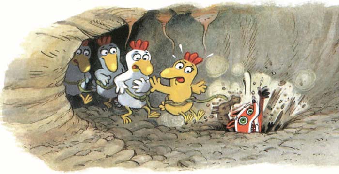 就在此刻,小母鸡们进入了狐狸的洞,越走越深。