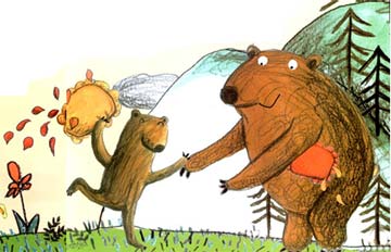 第三天,笨笨熊看见掉落一地的花瓣,又想到了一个主意,他在花瓣上写:“等回家,我要送一个惊喜!”这次呀,的回信是一幅画。画上,熊紧:紧地抱着笨笨熊!