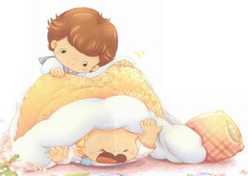 尼尼一掀被子,露出了胖逗逗圆溜溜的大脑袋。看,大西瓜长出来了!呵呵,吃西瓜喽!