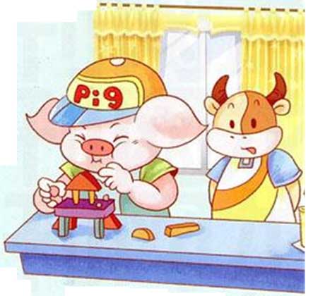 迪克猪用积木搭下一座城堡,可是他觉得城堡不够漂亮。迪克猪边想边咬着积木,积木上留下于他的牙齿印。