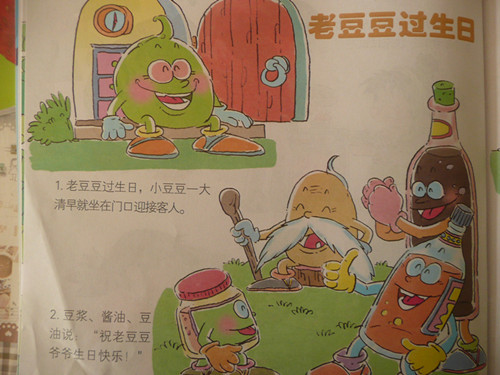 哈哈!客人来啦。你猜是谁?它们是豆浆、酱油、豆油。“祝老豆豆爷爷生日快乐!”豆浆、酱油、豆油齐声说。老豆豆乐的合不拢嘴说:“谢谢,谢谢,欢迎你们,我的好孩子。”