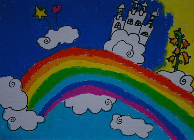 宝宝抬头望天上,哇!那是什么?天空中出现了有好多颜色一条一条的组成的半圆形,是多么的好看啊 !宝宝对着天空中问道:“哇!你好,新朋友,请问你叫什么名字?我怎么没有见过你?”