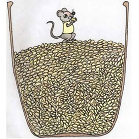 在一个青黄不接的初夏,一只在农家仓库里觅食的老鼠意外地掉进一个盛得半满的米缸里。这意外使老鼠喜出望外,它先是警惕地环顾了一下四周,确定没有危险之后,跳进米缸便是一通猛吃,吃完倒头便睡。