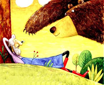 —天老园丁在果树睡午觉,熊在一旁帮他赶蚊子和苍蝇。果园里经常都有这些小东西飞来飞去。熊看见自己的好朋友睡的很香,开心的想:“瞧,多亏我帮忙,把苍蝇都赶跑了,他才能安安稳稳的睡。”